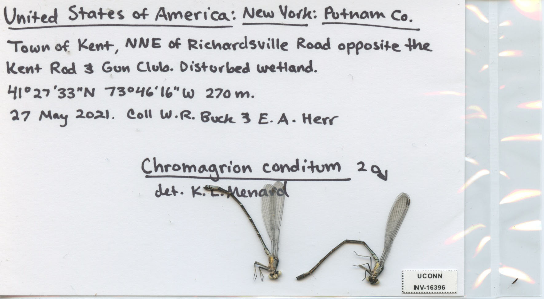 Town of Kent, NNE of Richardsville Road opposite the/Kent Rod & GunClub. Disturbed wetland./41°27'33"N 73°46'16"W 270m./27 May 2021. Coll W.R.Buck & E.A.Herr/Chromagrion conditum 2[male symbol]/det. K.L.Menard