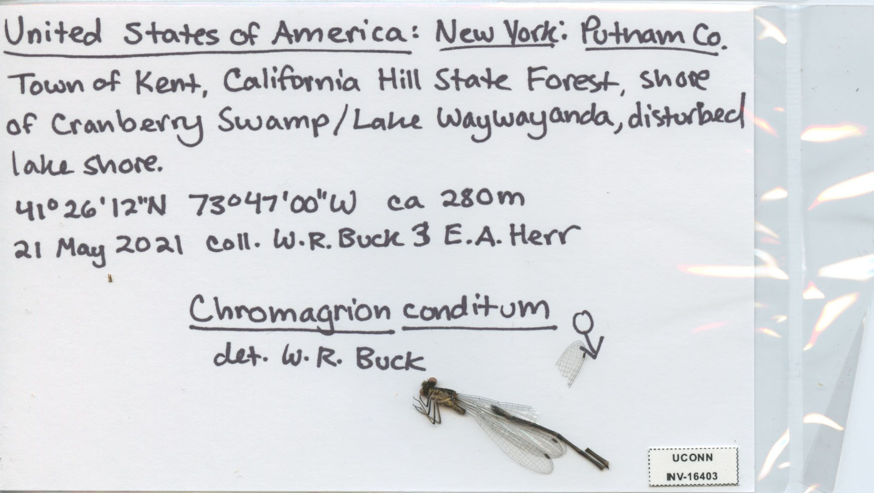 Town of Kent, California Hill State Frest, shore/of Cranberry Swamp / Lake Waywayanda, disturbed/ lake shore./41°26'12"N 73°47'00"W ca 280m/21 May 2021 coll. W.R.Buck & E.A.Herr/Chromgrion conditum [male symbol]/det. W.R.Buck