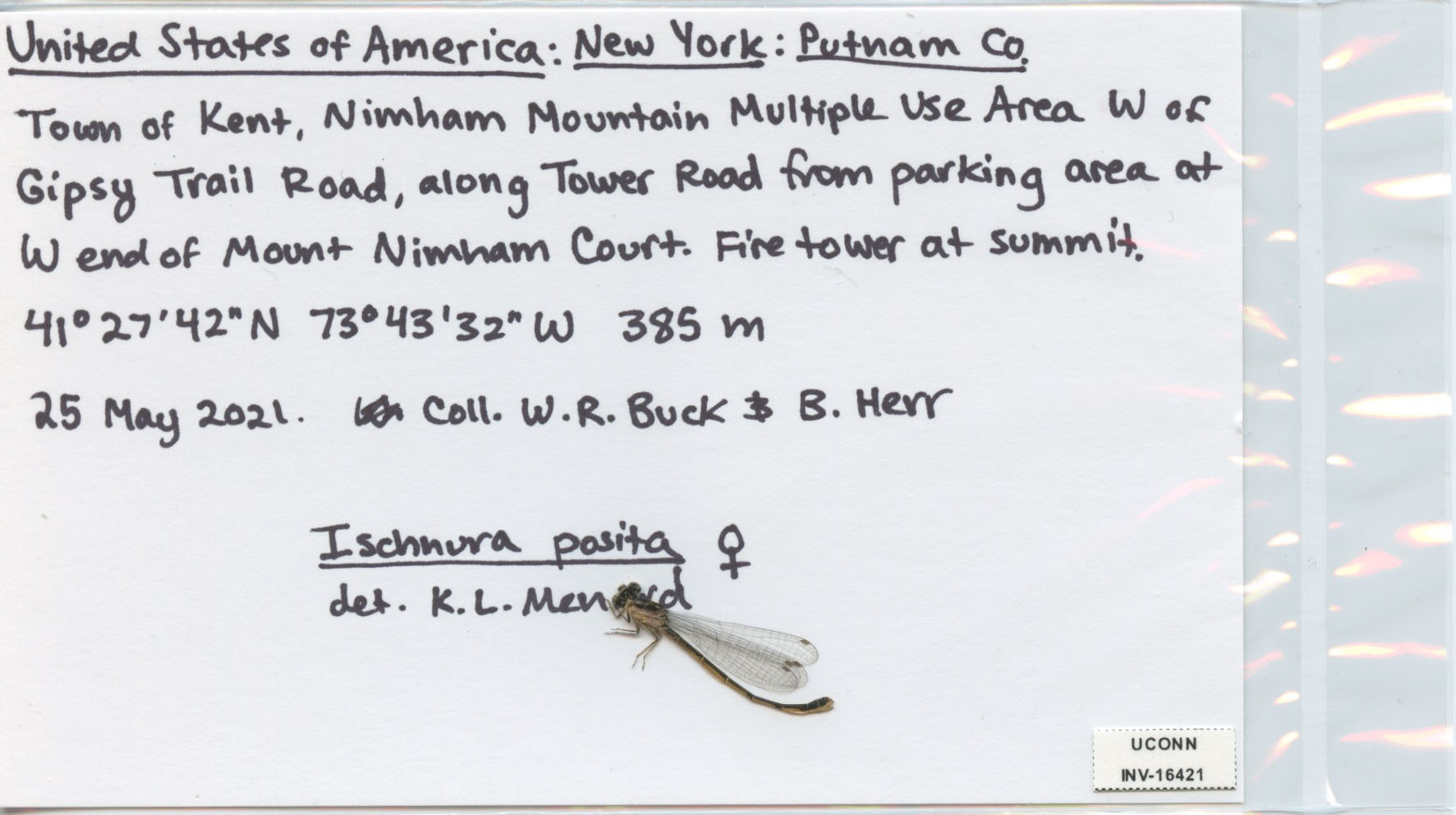 Town of Kent, Nimham Mountain Multiple Use Area W of/Gipsy Trail Road, along Tower Road from parking area at/W end of Mount Nimham Court. Firetower at summit./41°27'42"N 73°43'32"W 385 m/ 25 May 2021. Coll. W. R. Buck & B. Herr/Ischnura posita [female sym