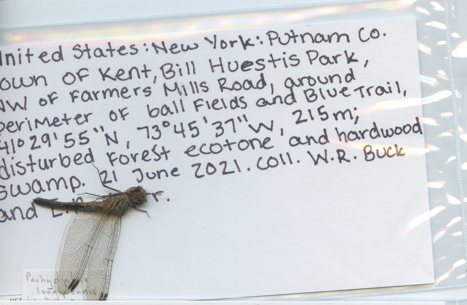 Town of Kent, Bill Huestis Park,/NW of Farmers Mills Road, around/perimeter of ball fields and Blue Trail,/41°29'55"N 73°45'37"W, 215 m;/disturbed forest ecotone and hardwood/swamp. 24 June 2021. W. R. Buck/and E. A. Herr