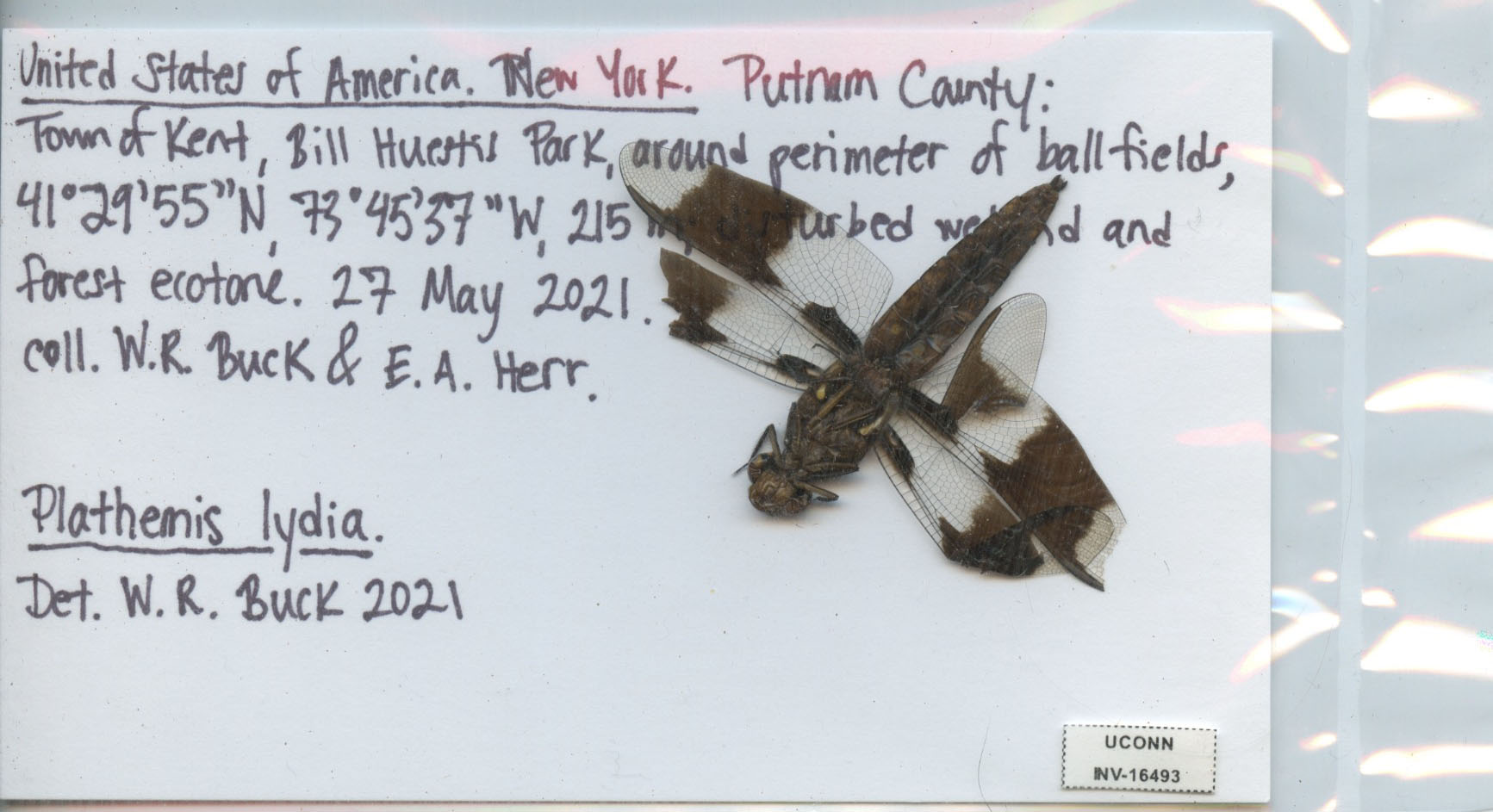 Town of Kent, Bill Huestis Park, around perimiter of ball fields,/41°29'55"N, 73°45'37"W, 215 m; disturbed wetland and/forest ecotone. 27 May 2021./coll. W. R. Buck & E. A. Herr/Plathemis lydia/Det. W. R. Buck 2021