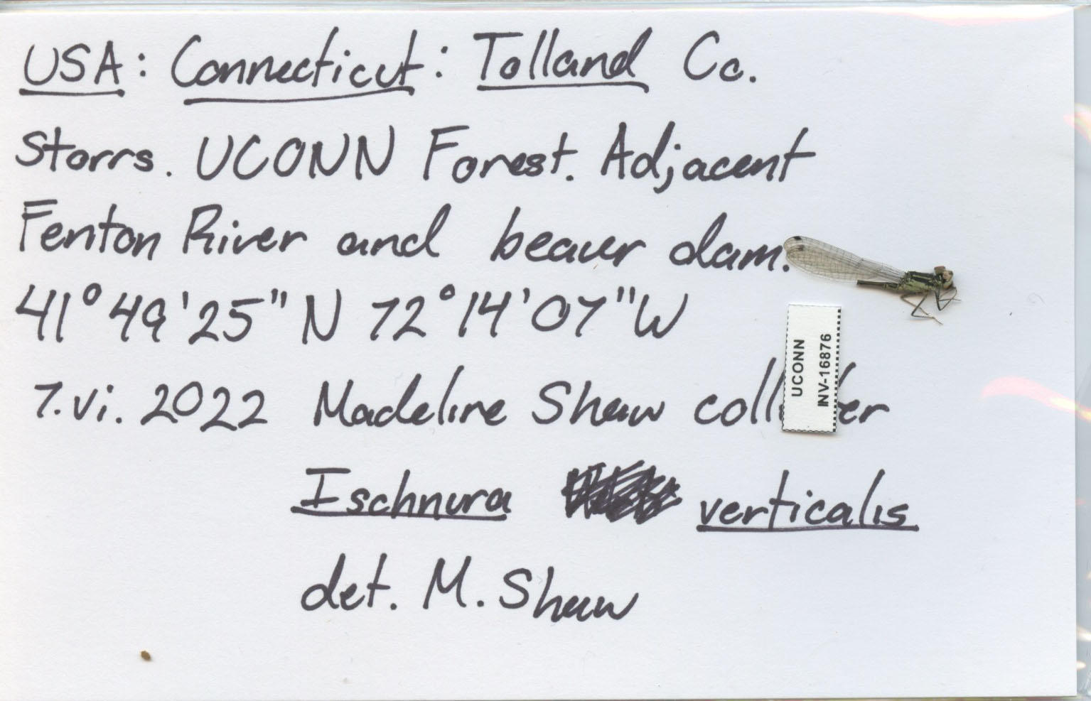 USA: Connecticut: Tolland Co./Storrs. UCONN Forest. Adjacent/Fenton River and beaver dam./41°49'25"N 72°14'07"W/7.vi.2022 Madeline Shaw collector/Ischnura verticalis/det. M. Shaw