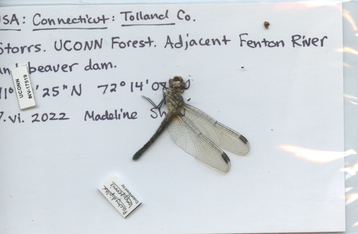USA: Connecticut: Tolland Co./Storrs. UCONN Forest. Adjacent Fenton River/and Beaver dam./41°49'25"N 72°14'07"W/7.vi.2022 Madeline Shaw collector.;Pachydiplax/longipennis/determined by