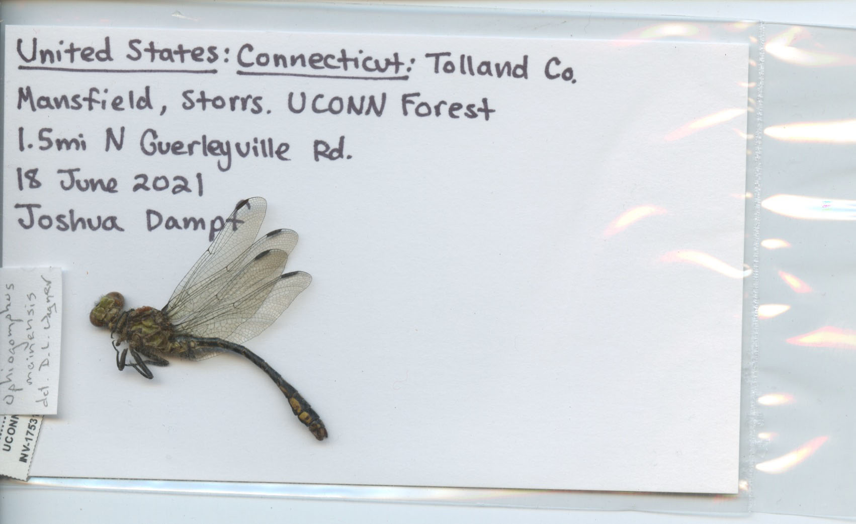 United States: Connecticut: Tolland Co./Mansfield, Storrs. UCONN Forest/1.5 miles N Gurleyville Rd./18 June 2021/Joshua Dampf;Ophiogomphus/meinensis/det. D. L. Wagner