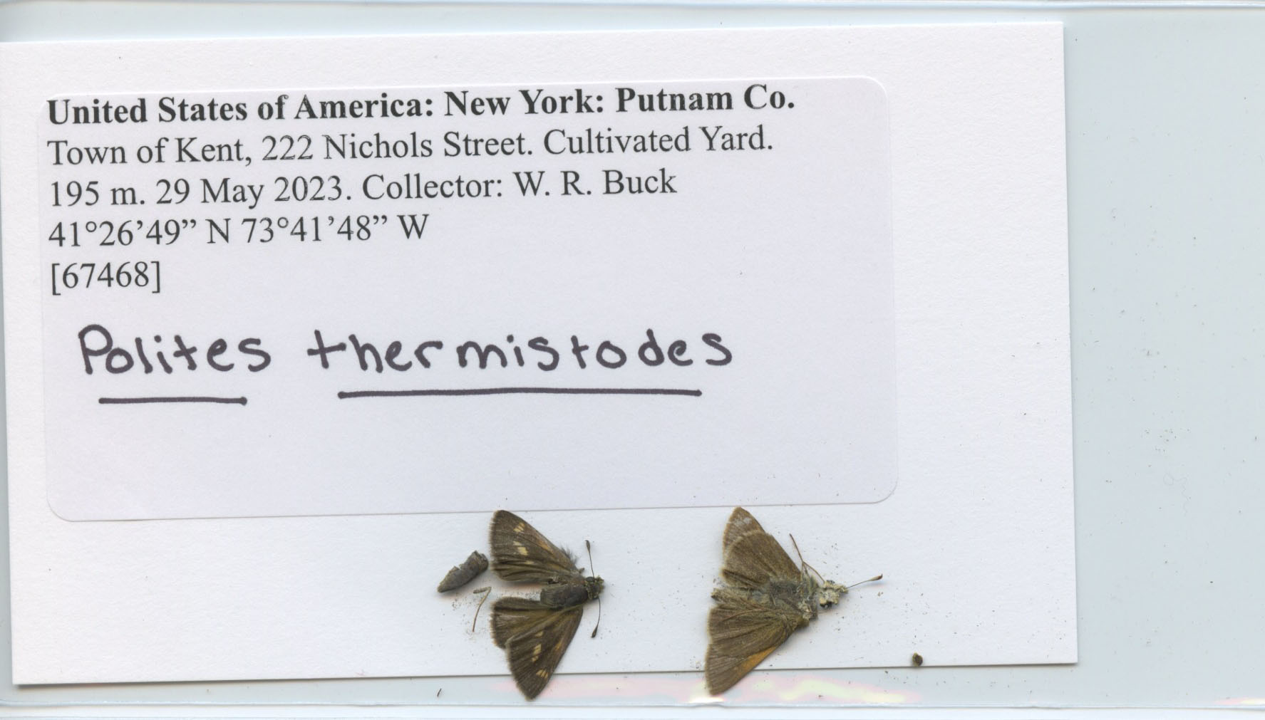 United States of America: New York: Putnam Co./ Town of Kent, 222 Nichols Street. Cultivated yard./ 195 m. 29 May 2023. Collector: W. R. Buck/ 41°26'49" N 73°41'48" W/ [67468]/ Polites thermistocles