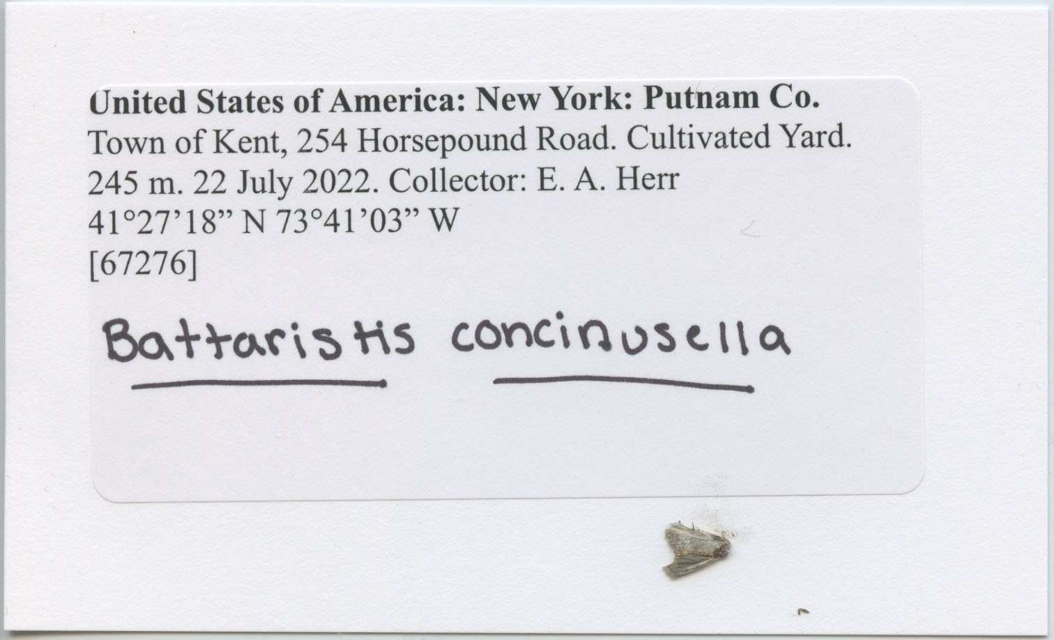 United States of America: New York: Putnam Co./ Town of Kent, 254 Horsepound Road. Cultivated Yard/ 245 m. 6 August 2022. Collector: E.A. Herr/ 41°27'18" N 73°41'03" W/ [67276]/ Battaristis concinusella [spelling]