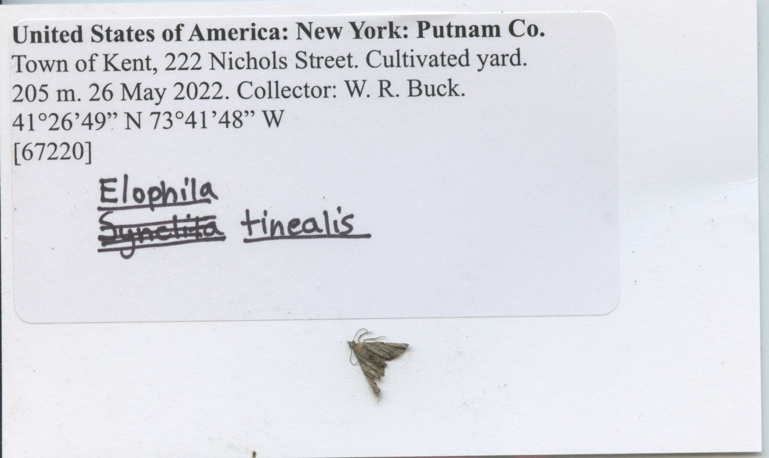 United States of America: New York: Putnam Co./ Town of Kent, 222 Nichols Street. Cultivated yard./ 205 m. 26 May 2022. Collector: W. R. Buck/ 41°26'49" N 73°41'48" W/ [67220]/ Elophila tinealis