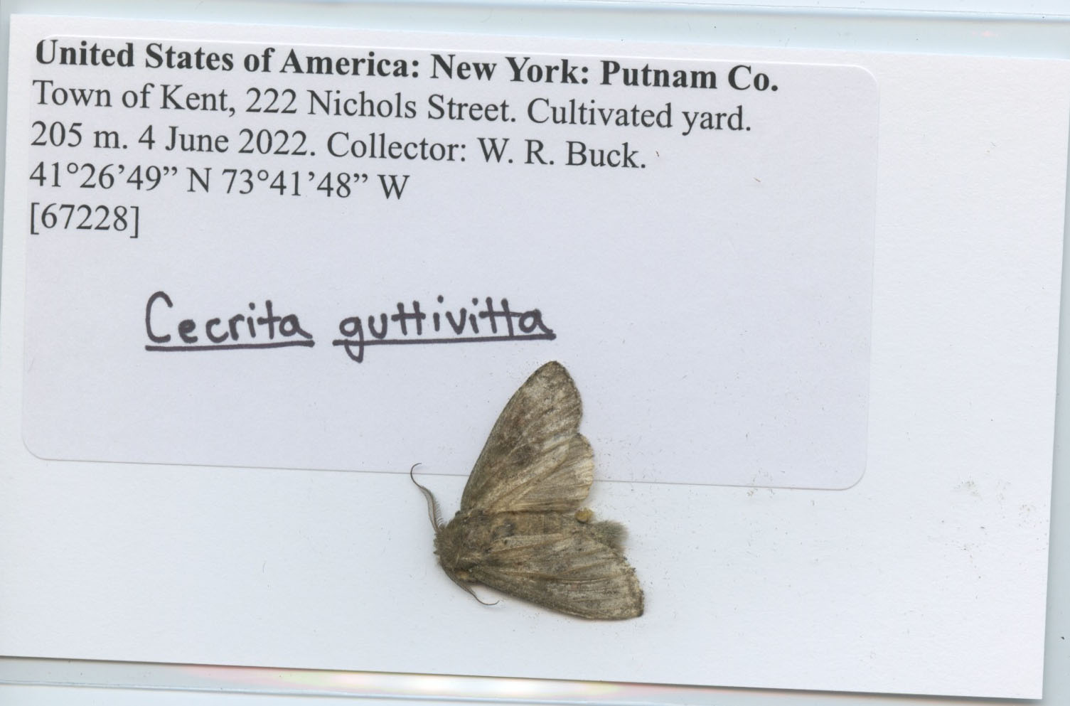 United States of America: New York: Putnam Co./ Town of Kent, 222 Nichols Street. Cultivated yard./ 205 m. 4 June 2022. Collector: W. R. Buck/ 41°26'49" N 73°41'48" W/ [67228]/ W.R. Buck/ Cecrita guttivitta