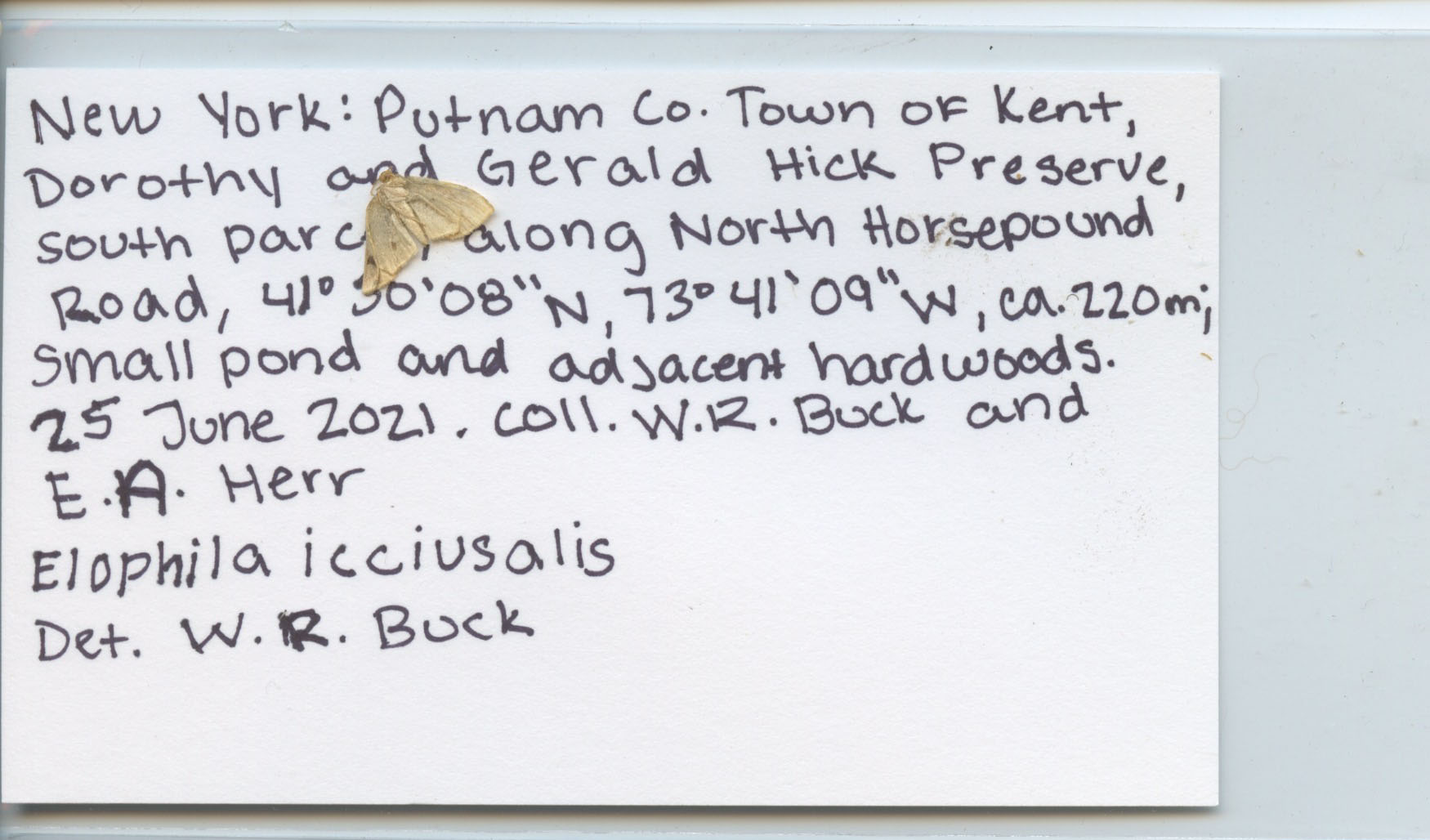 New York: Putnam Co. Town of Kent,/ Dorothy and Gerald Hick Preserve,/ south parcel, along North Horsepound/ Road 41°30'08" N 73°41'09" W, ca. 220 m/ small pond and adjacent hardwoods/ 25 June 2021. coll. W.R. Buck and/ E.A. Herr/ Elophila iccusalis/ Det.