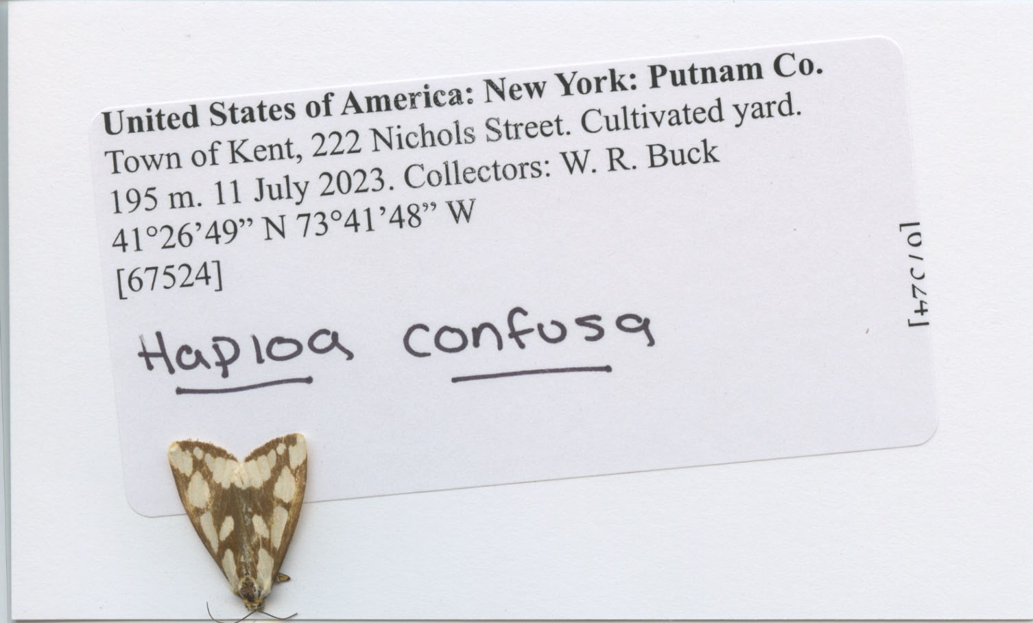United States of America: New York: Putnam Co./ Town of Kent, 222 Nichols Street. Cultivated yard./ 195 m. 11 July 2023. Collector: W. R. Buck/ 41°26'49" N 73°41'48" W/ [67524]/ Haploa confusa