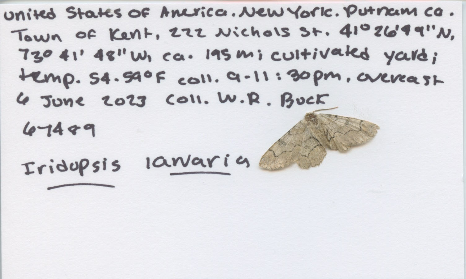 United States of America: New York: Putnam Co./ Town of Kent, 222 Nichols St. 41°26'49" N,/ 73°41'48" W, ca. 195 m; cultivated yard;/ temp. 54.59 degrees F coll. 9-11:30 pm, overeeast/ 6 June 2023 coll. W.R. Buck/ 67489/ Iridopsis lavaria