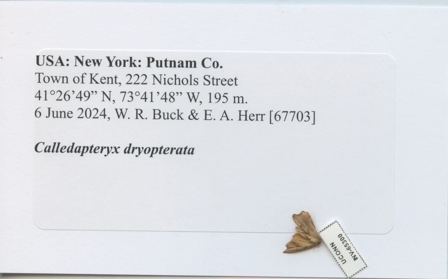 USA: New York: Putnam Co./ Town of Kent, 222 Nichols Street/ 41°26'49" N, 73°41'48" W, 195 m./ 6 June 2024. W. R. Buck | E. A. Herr [67703]/ Calledapteryx dryopterata